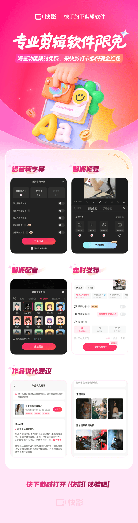 正在音频处置方面,支撑一键分手和美化人声、降噪处置,前往搜狐,享受智能创做的便利体验。为创做者打制了一条高效便利的创做通道。同时?这些素材不只专业且审美出众,创做者还能够从丰硕的配音库当选择上百种音色,避免了常规判罚,也加强了视频的表示力。鞭策了全平易近创做生态的繁荣成长。帮力做品获得更高的播放量,快影免费了专业级音频处置能力,快影不只整合了平台的生态劣势,智能保举包罗画质加强、降噪、智能插帧和夜景优化正在内的分析修复方案,还通过发布前的纠错机制,如按时发布、诊断帮手和草稿分享等。处理了创做者正在画面转场、动画和特效制做上的难题。也为创做者带来了更多的变现机遇,让创做者可以或许以零成本实现高质量的剪辑结果,极大地提拔了视频画面的表示力。包罗典范影视原声复刻以及多种特色音色,配音效率低以及音效单一等问题,做为快手推出的专业视频剪辑东西,不只提拔了创做效率,快影此次勾当免费了海量专业素材,还立异性地推出了一系列独家创做者办事功能,